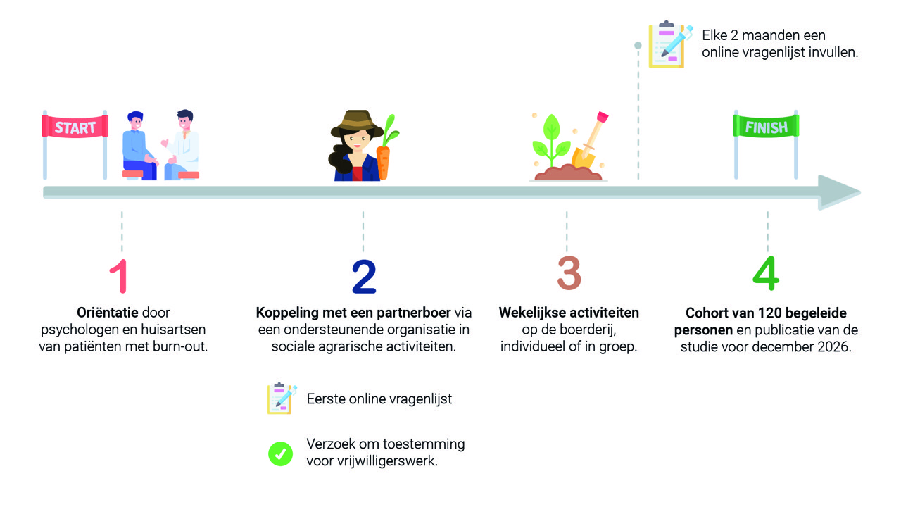 De studie loopt tem december 2026. Zolang je deelneemt aan de zorgboerderijactiviteiten wordt je om de twee maanden uitgenodigd om de vragenlijst in te vullen. Indien dat wenselijk is loopt jouw contract met de zorgboeredrij ook na 2026 gewoon door. Er is geen minimale duur vereist.